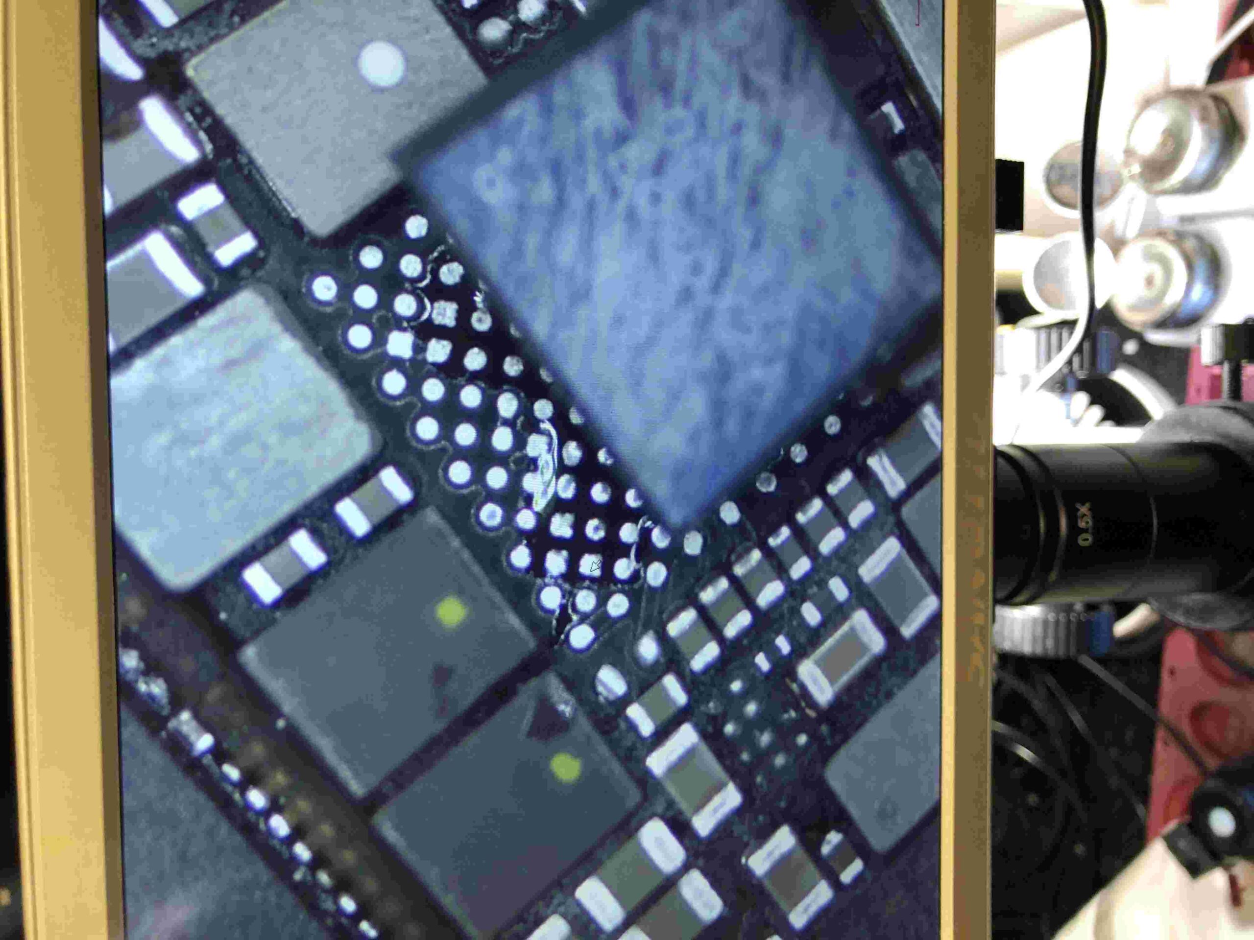 顕微鏡下に置いて、新しい電源ICチップを取り付けていきます。
