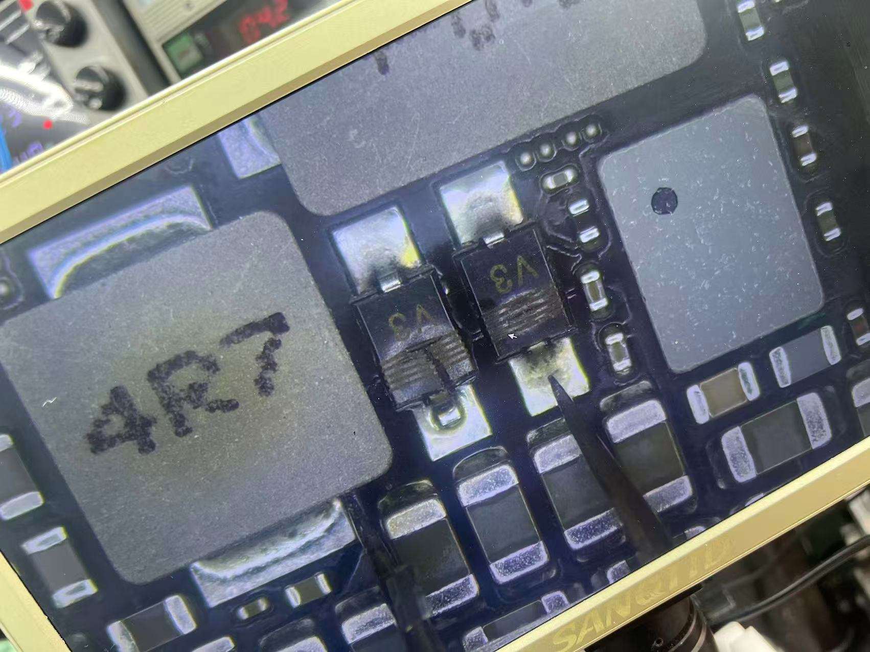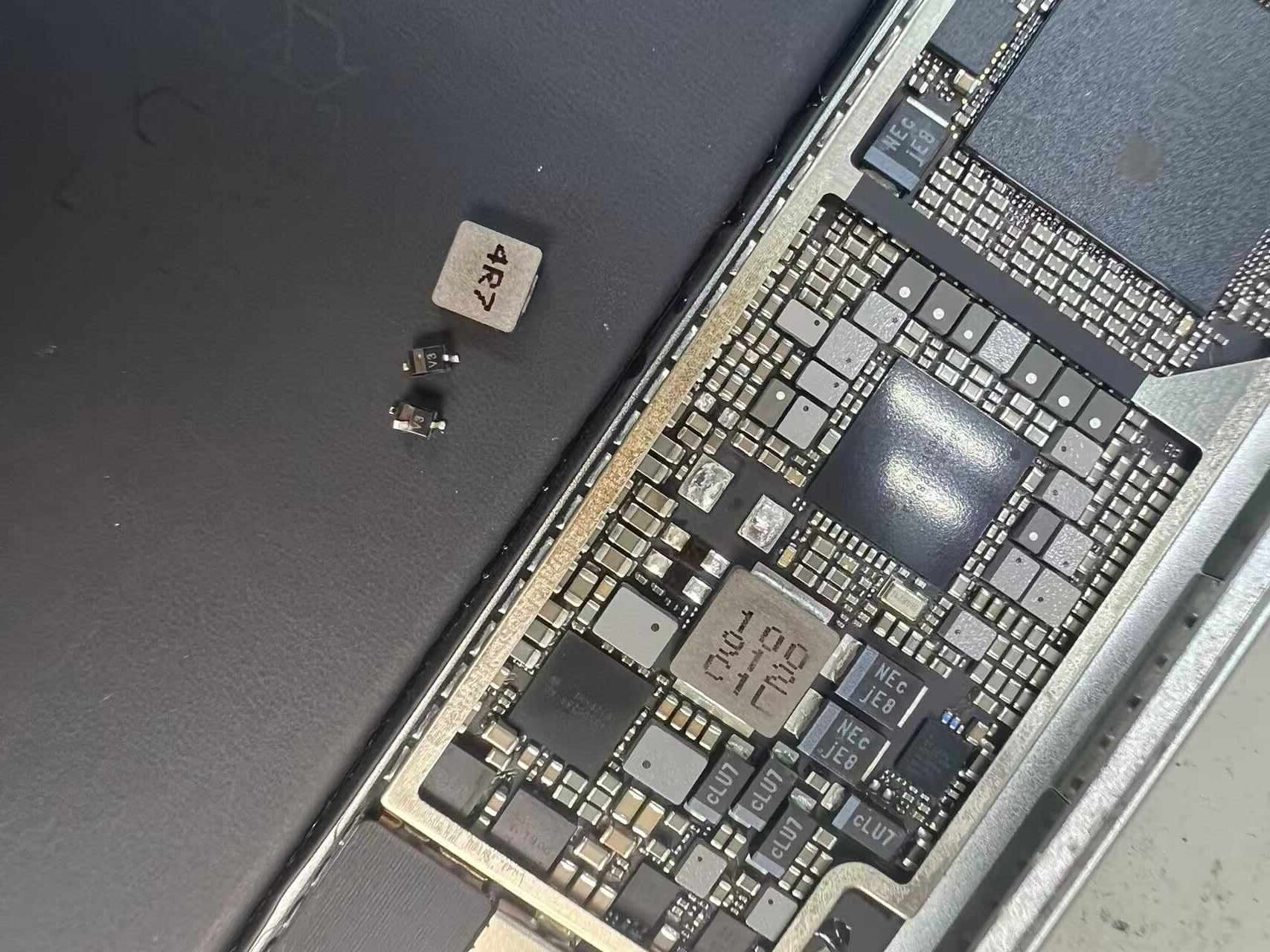 焼け壊れた電子パーツをiPad Mni5の基板から取り外しました。