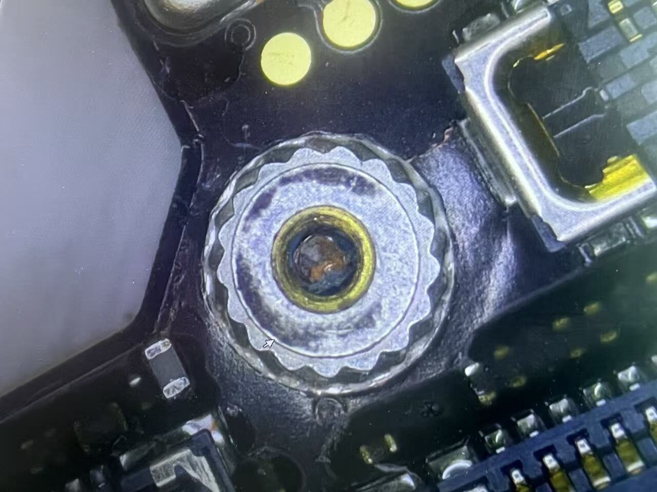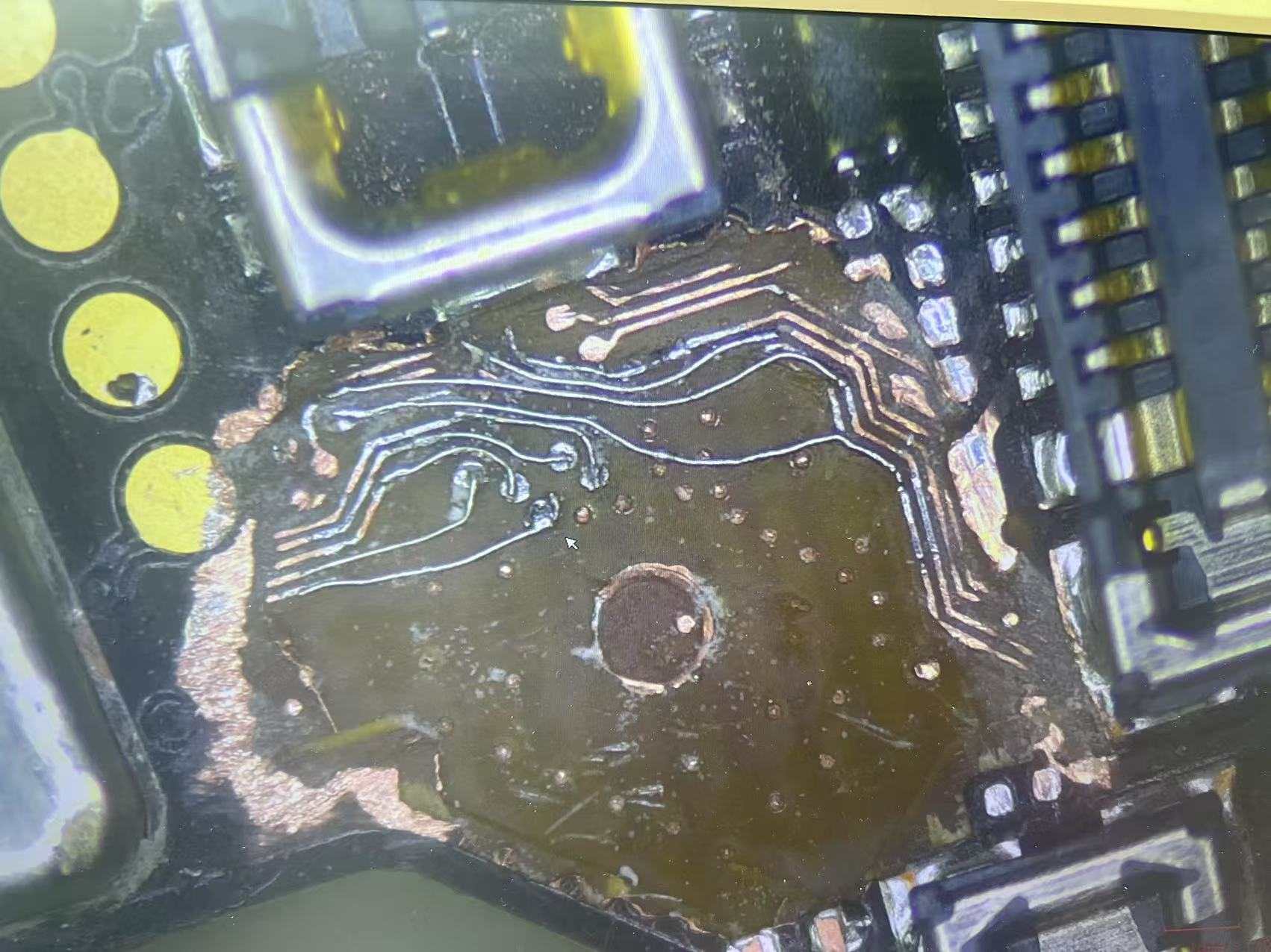 iPhone13Miniをお受取り後、当社にて本体を分解し顕微鏡を使い基板を観察したところ、ネジの挿し間違いによる基板層の断線がございました。